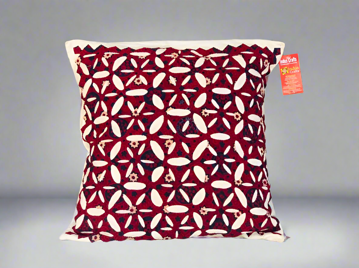This stunning cushion cover beautifully showcases the timeless elegance of Ajrak-inspired embroidery. Crafted with intricate hand-stitched patterns, the deep red fabric is adorned with symmetrical white and blue floral and geometric motifs, reflecting the rich cultural heritage of Sindh. The delicate cutwork detailing enhances the overall aesthetic, adding texture and depth to the design.