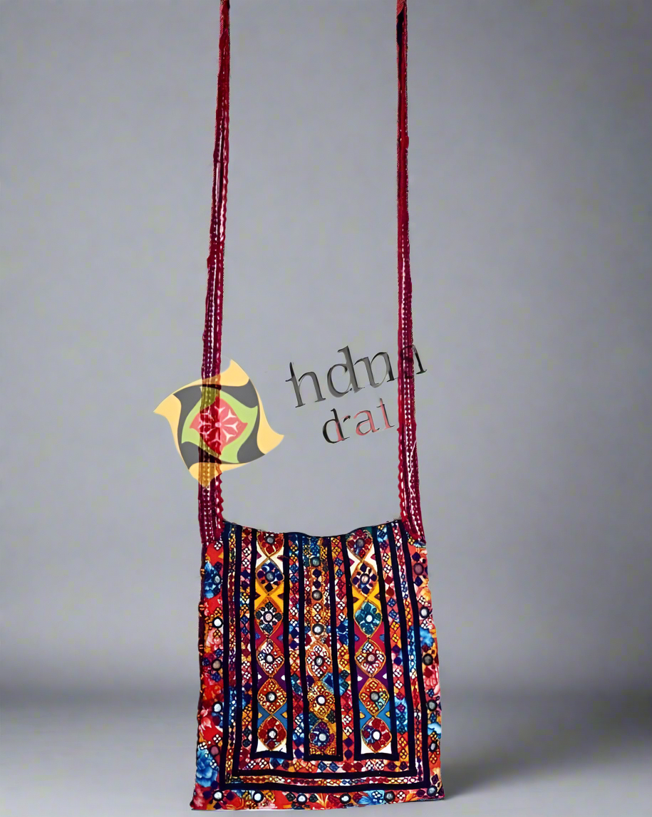 Carry a piece of vibrant Balochi artistry with this beautifully handcrafted shoulder bag from Indus Crafts. This unique bag showcases the intricate embroidery traditions of Balochistan, crafted with a focus on recycling and sustainability.