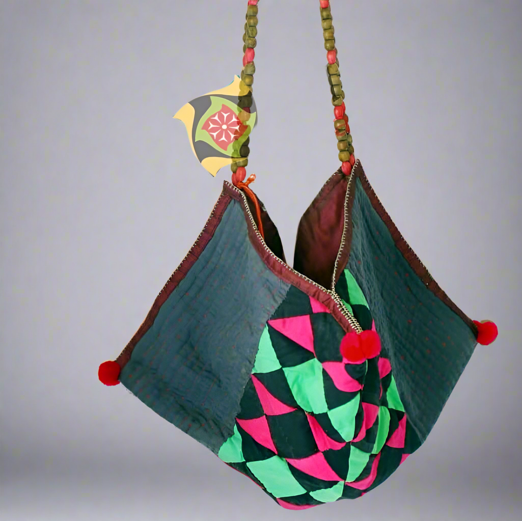 A true representation of Sindhi craftsmanship, this Jogi Shoulderย Bag features a striking combination of black, green, and pink triangular patterns. The intricate hand-stitched detailing enhances the bags authenticity, while the beaded handle and playful pom-poms give it a bohemian flair. This bag is perfect for those who love blending traditional styles with a contemporary touch, making it a bold yet timeless fashion statement.