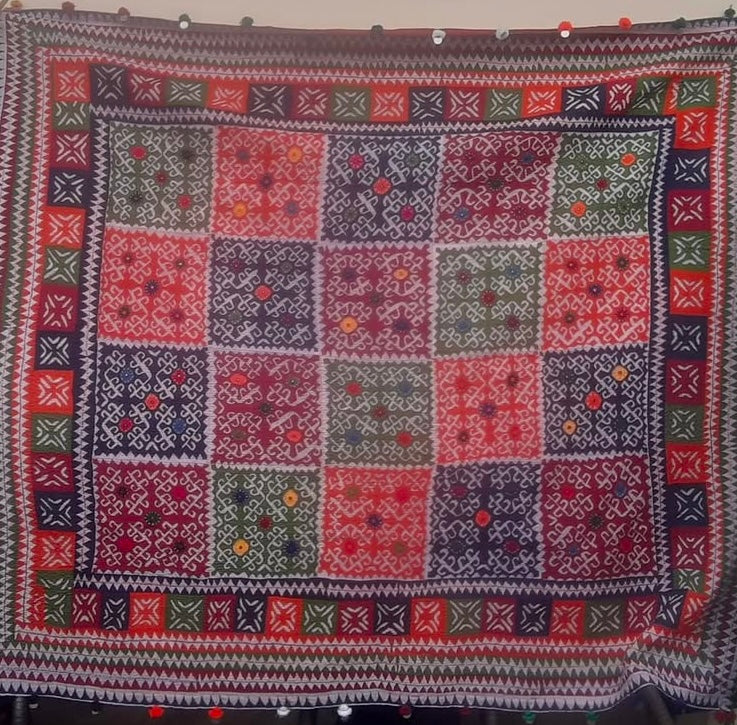 This handcrafted Ralli quilt features intricate embroidery with traditional patterns, creating a mesmerizing patchwork design. The symmetrical arrangement of colorful squares, enhanced with floral and geometric motifs, showcases the meticulous skill of artisans. The vibrant border, adorned with fine detailing and small mirrors, adds an extra touch of elegance. Perfect as a bedspread, wall hanging, or decorative throw, this quilt represents the cultural richness of South Asian textile art.