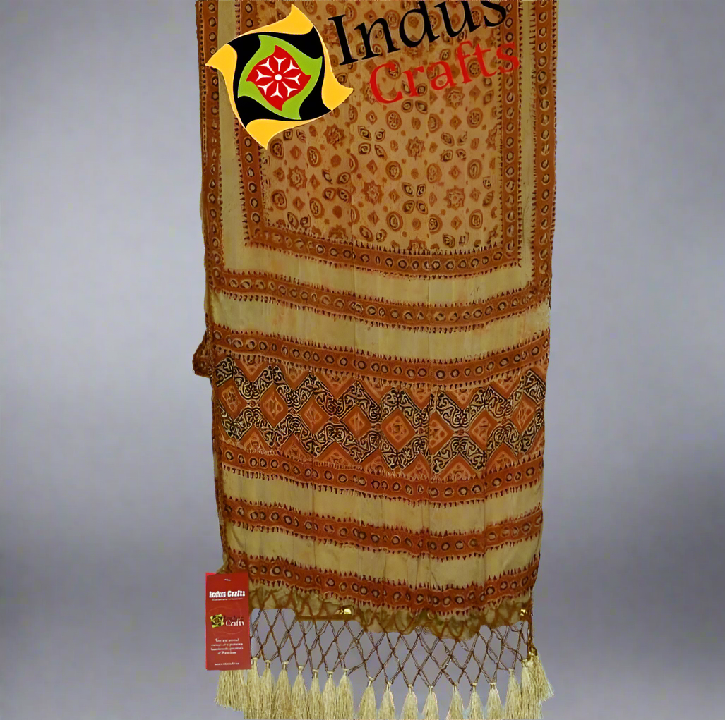 Wrap yourself in the timeless beauty of this handcrafted Ajrak dupatta, a true embodiment of traditional artistry and cultural heritage. Made with natural dyes and adorned with intricate patterns, this dupatta reflects the skilled craftsmanship of artisans from Sindh, Pakistan. The warm earthy tones, paired with geometric and floral motifs, create a mesmerizing design that tells a story of centuries-old printing techniques.