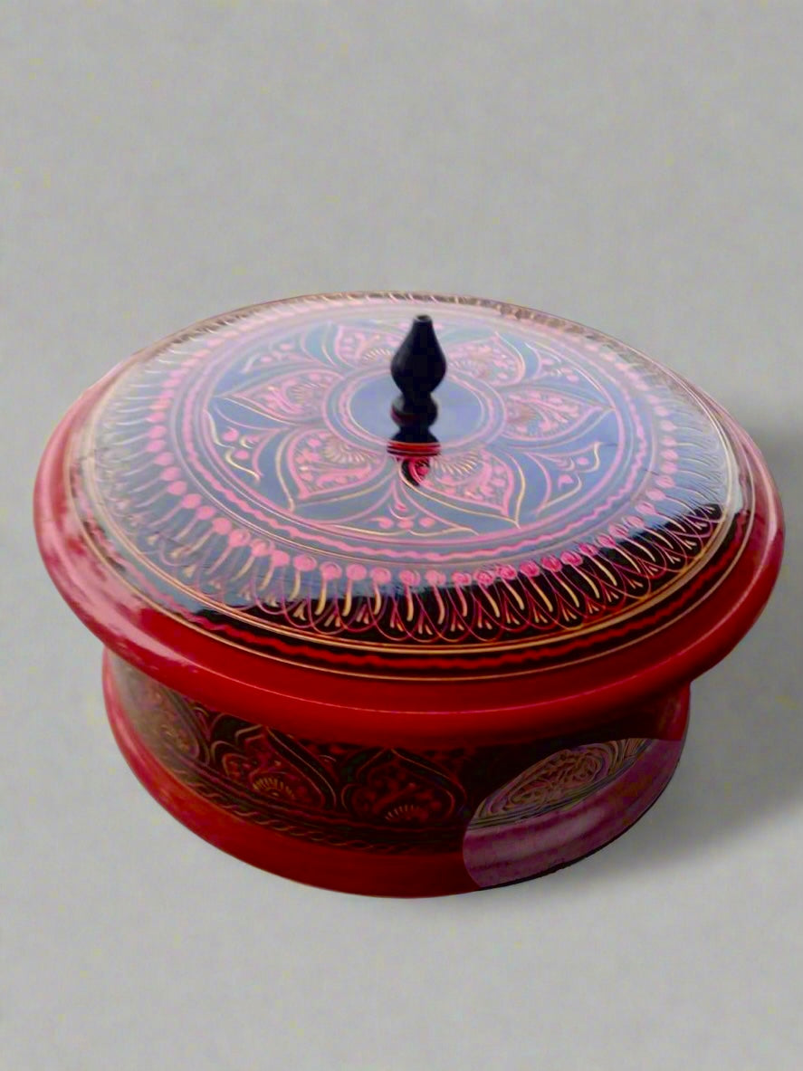 A masterpiece of artistry, this round wooden box is adorned with detailed geometric and floral patterns in bold red, black, and gold hues. Its glossy lacquer finish enhances the delicate hand-painted motifs, making it ideal for storing jewelry, dry fruits, or treasured keepsakes. The smooth curves and ornate lid with a black finial make it a centerpiece in any home.