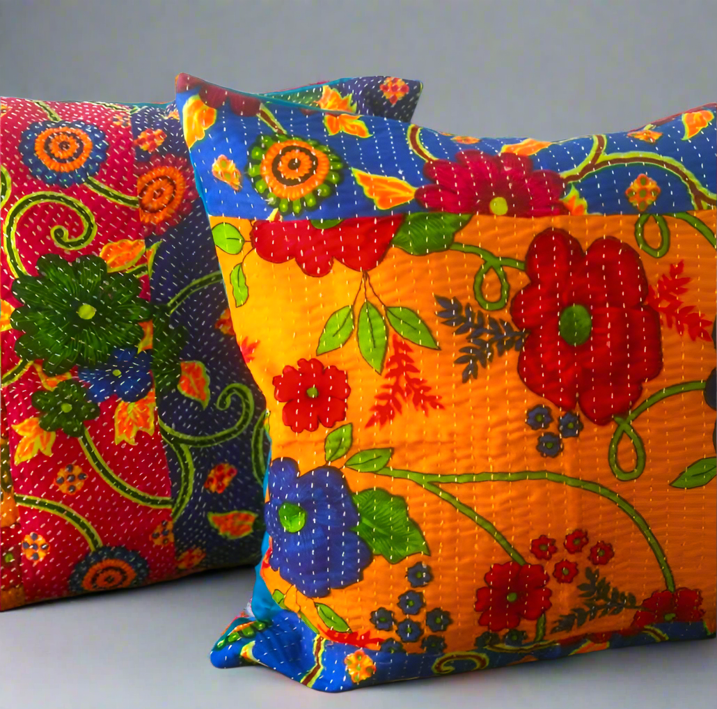 Brighten up any room with our Handcrafted Floral Throw Cushion, a beautiful blend of intricate design and vibrant color. This cushion features a stunning floral motif, meticulously crafted using detailed stitching and quilting techniques. The combination of rich, lively hues and delicate patterns creates an inviting and cheerful ambiance, making it the perfect accent for your sofa, bed, or favorite chair.