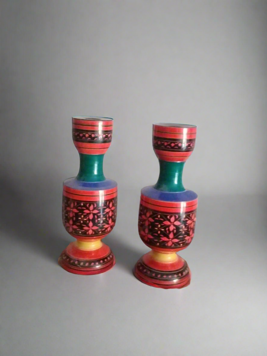 Symbolizing elegance and tradition, these wooden goblets are painted in vibrant shades of red, green, and blue. The symmetrical floral designs represent the timeless beauty of Sindhi folk art. These goblets can be used for decorative purposes, serving as unique candle holders or simply as artistic showpieces that add a touch of culture to your home.