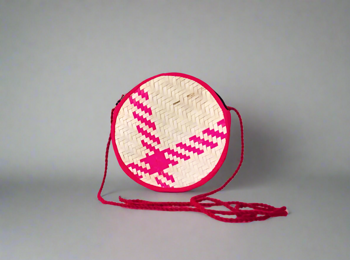 Elevate your style with this exquisite handcrafted round purse, meticulously woven from natural date palm leaves by skilled artisans. Designed with a unique pink geometric pattern, this purse beautifully blends traditional craftsmanship with modern aesthetics. Its vibrant hues and intricate weave reflect the rich heritage of handmade artistry, making it a statement piece for any occasion.