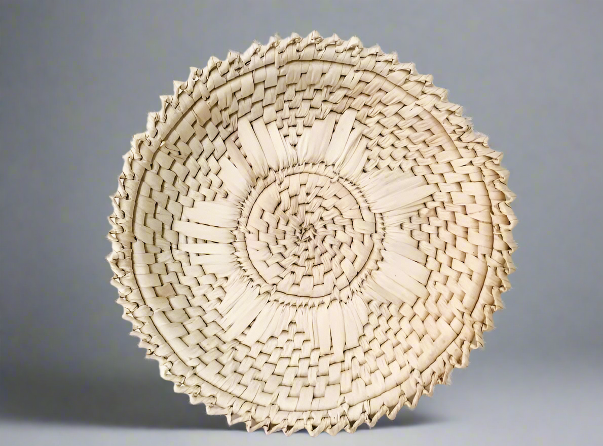 This intricately woven small platter, crafted from natural date palm leaves, showcases the beauty of traditional craftsmanship. Its detailed radial pattern and sturdy construction make it a versatile piece, perfect for serving dry snacks, bread, or fruits. The lightweight yet durable design ensures easy handling, while its eco-friendly material promotes sustainability. Whether used in the kitchen, as a decorative centerpiece, or for gifting, this handmade platter brings a rustic charm to any space.