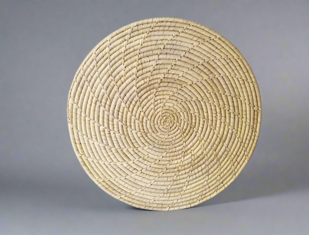 The placemat is meticulously handwoven from date palm leaves, creating a circular design with a captivating spiral pattern. The natural tones and textures of the palm leaves add a rustic charm to any table setting.