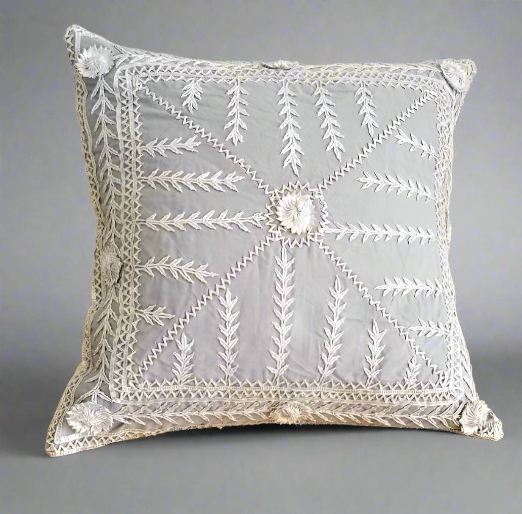 The cushion is designed with a delicate pattern, meticulously stitched in a light thread against a soft, pale background. The detailed embroidery creates a visually appealing texture and adds a touch of sophistication to any dรฉcor. Measuring 16"x16", this cushion is perfect for adding comfort and style to your sofa, armchair, or bed.