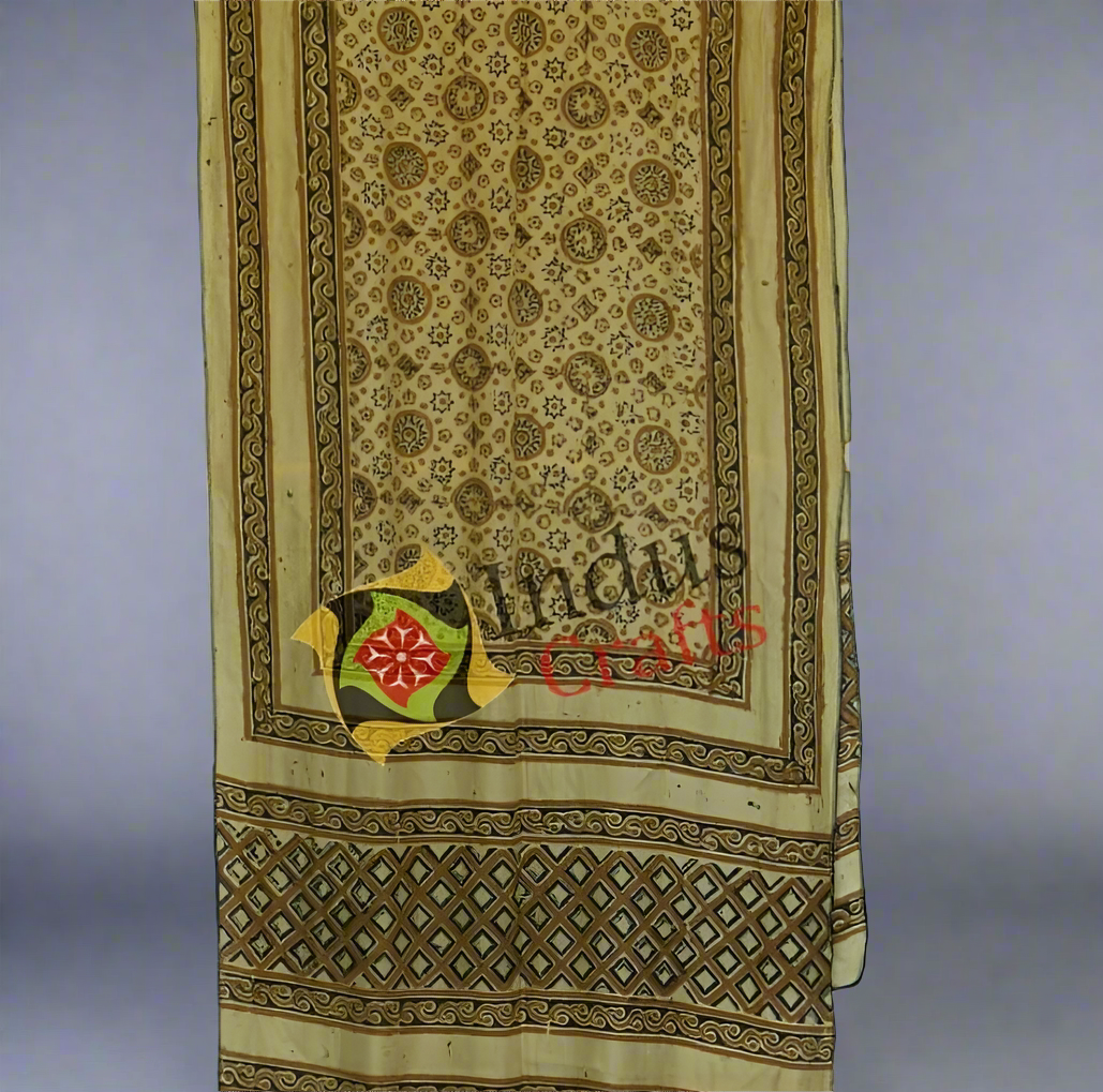 This exquisite hand block-printed dupatta showcases a stunning blend of intricate floral and geometric designs, embodying the timeless beauty of traditional craftsmanship. While it takes inspiration from the renowned Ajrak printing style, it features a more earthy color palette with shades of beige, brown, and black, rather than the classic deep indigo and red hues associated with authentic Ajrak. The meticulously arranged motifs and symmetrical borders reflect the expertise of skilled artisans, who use age-old resist block-printing techniques to create such masterpieces.