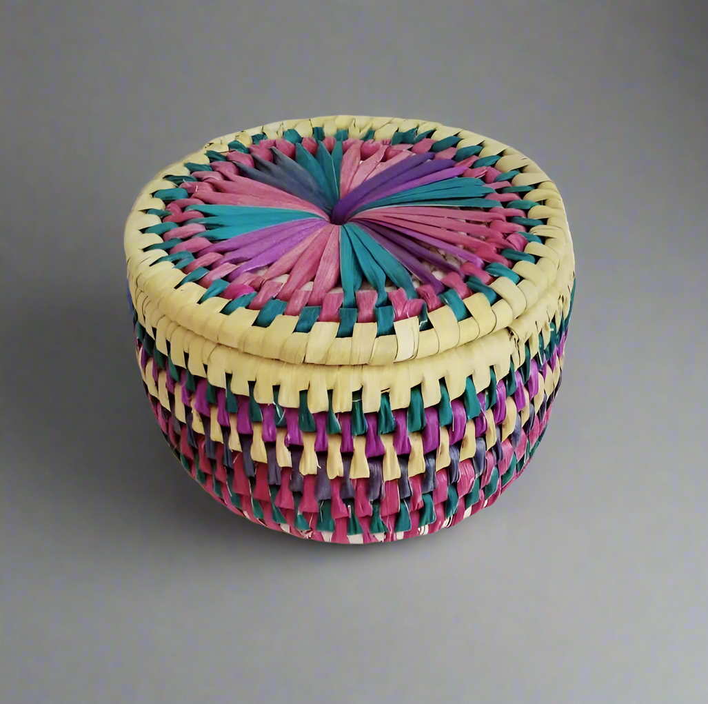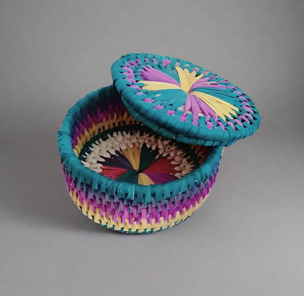 This beautifully handcrafted jewelry box is made from natural date palm leaves, featuring an intricate woven pattern in vibrant shades of pink, purple, teal, and beige. Its sturdy design makes it perfect for storing your precious jewelry, trinkets, or small keepsakes. The traditional weaving technique gives it a unique and cultural charm, making it both a functional and decorative piece for your home.