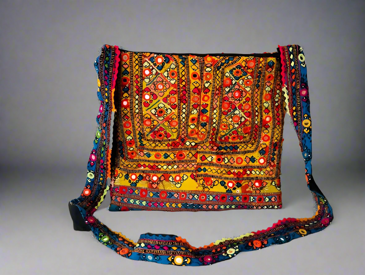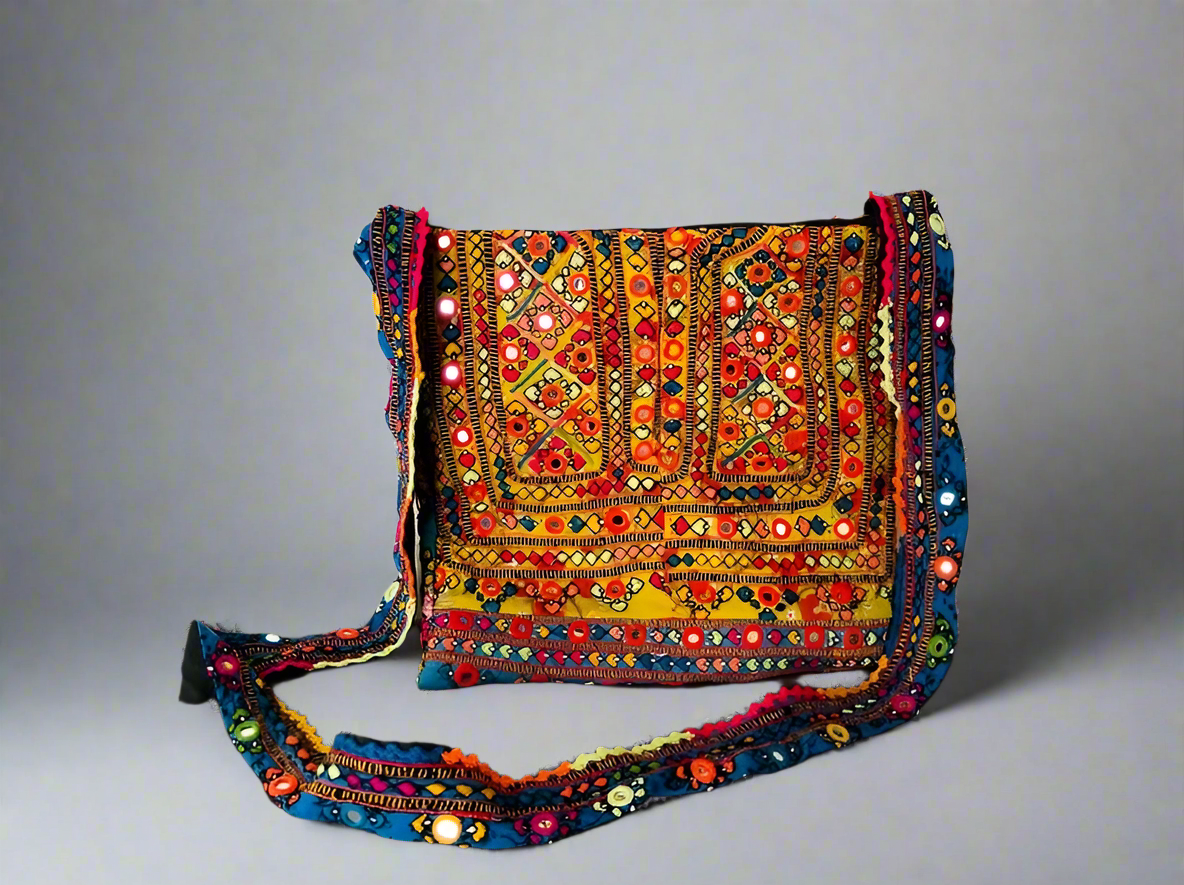 The bag is adorned with a kaleidoscope of colors, featuring traditional embroidery patterns and shimmering mirror work that catches the light beautifully. The intricate detailing and bold color combinations reflect the skill and creativity of local artisans.