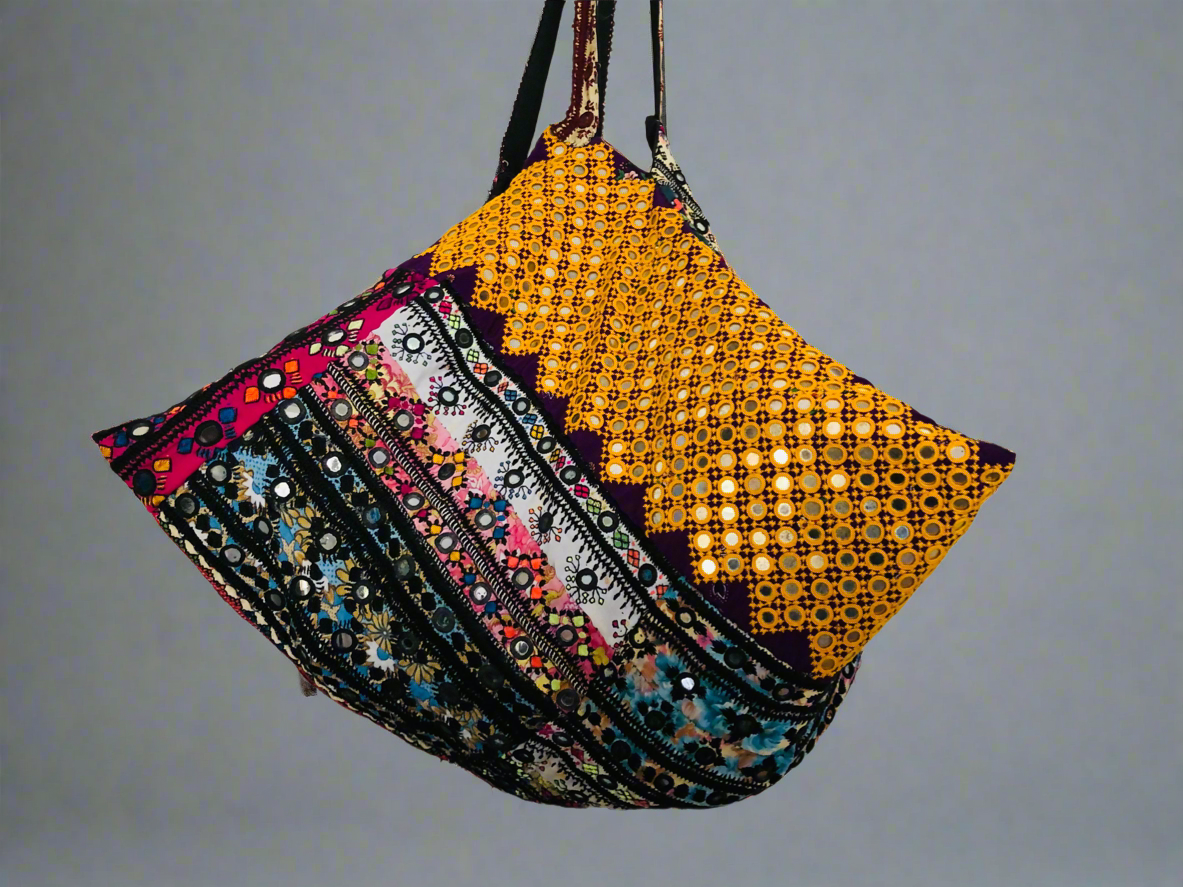 Elevate your style with this eye-catching handcrafted tote bag, featuring a unique patchwork of vibrant embroidery and mirror work. A stunning blend of traditional and contemporary design, this spacious bag is perfect for carrying essentials in style. The bold yellow, pink, and multicolor fabric is adorned with intricate geometric and floral patterns, making it a standout accessory for any occasionรขโฌโwhether itรขโฌโขs a casual outing, festival, or travel. The sturdy shoulder straps ensure comfort, while the intricate detailing showcases the rich heritage of skilled artisans. Add this beautiful piece to your collection for a perfect mix of culture and fashion!