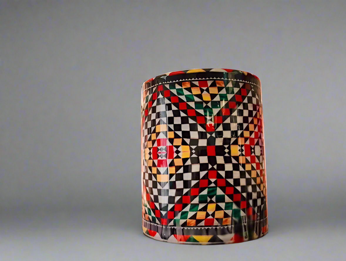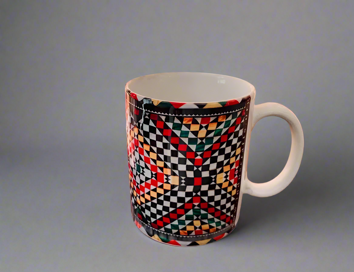 This unique ceramic mug features a vibrant and intricate print inspired by traditional Sindhi Ralli quilt patterns. The geometric black-and-white checkered design is enhanced with colorful accents, reflecting cultural heritage in a modern, functional form. Perfect for tea, coffee, or any hot beverage, this artistic mug brings a touch of tradition to your everyday routine. A great gift for art lovers and cultural enthusiasts!