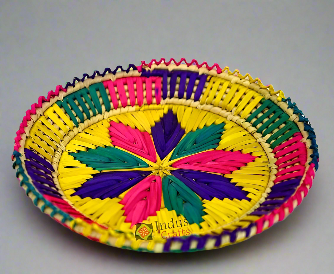 The pindi's circular form is meticulously handwoven, creating a symmetrical pattern that radiates outwards from the center. The warm, natural tones of the palm leaves are enhanced by colorful accents, creating a cheerful and eye-catching display. The intricate weaving technique and the radiant design make this pindi a true work of art.