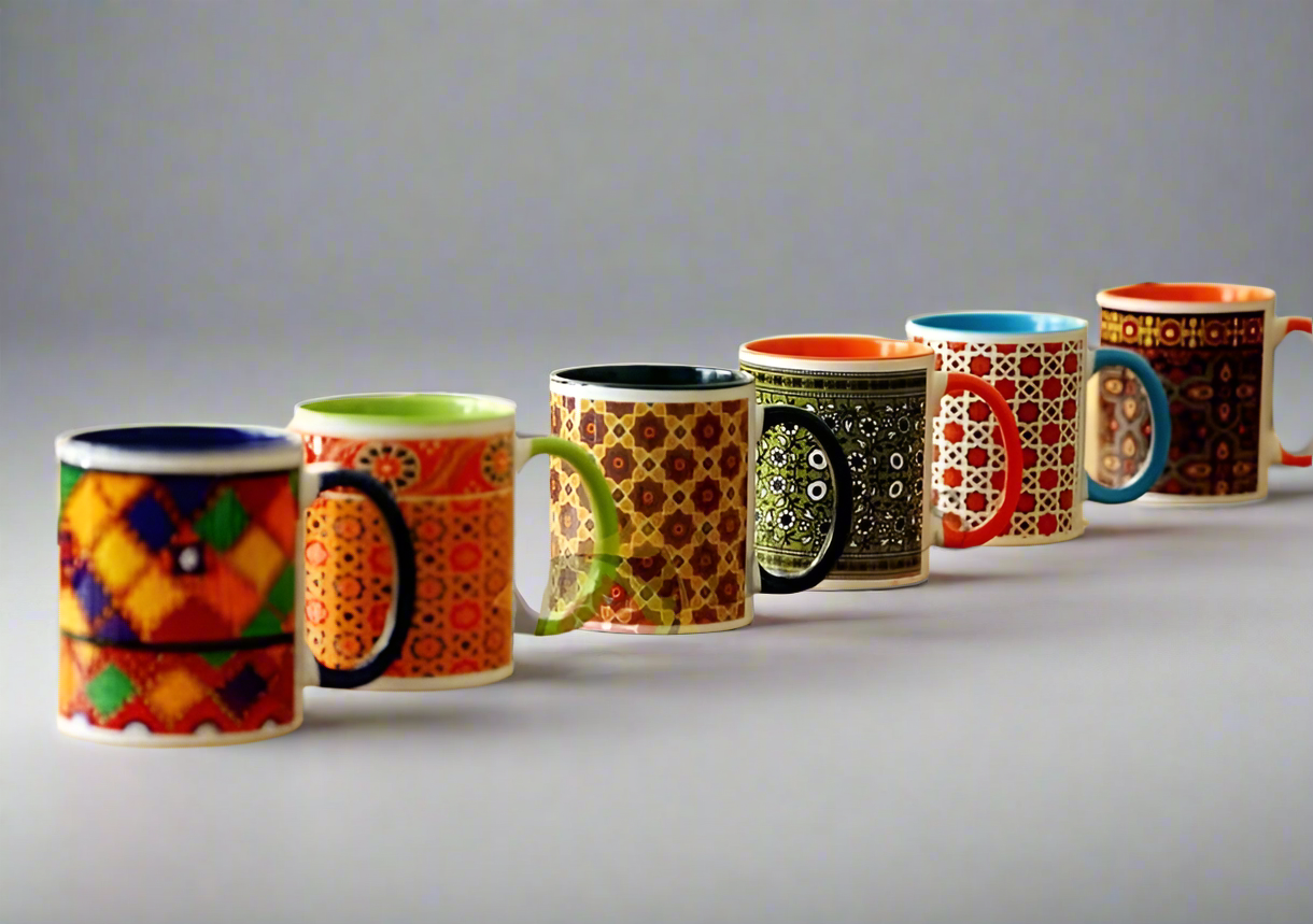 Each mug features a unique design, ranging from geometric motifs to intricate floral patterns, all rendered in a rich palette of colors. The craftsmanship is evident in the fine details and the precision of the handwork. These mugs are not just functional, but also serve as beautiful decorative pieces that add a touch of authentic Pakistani charm to your table setting.