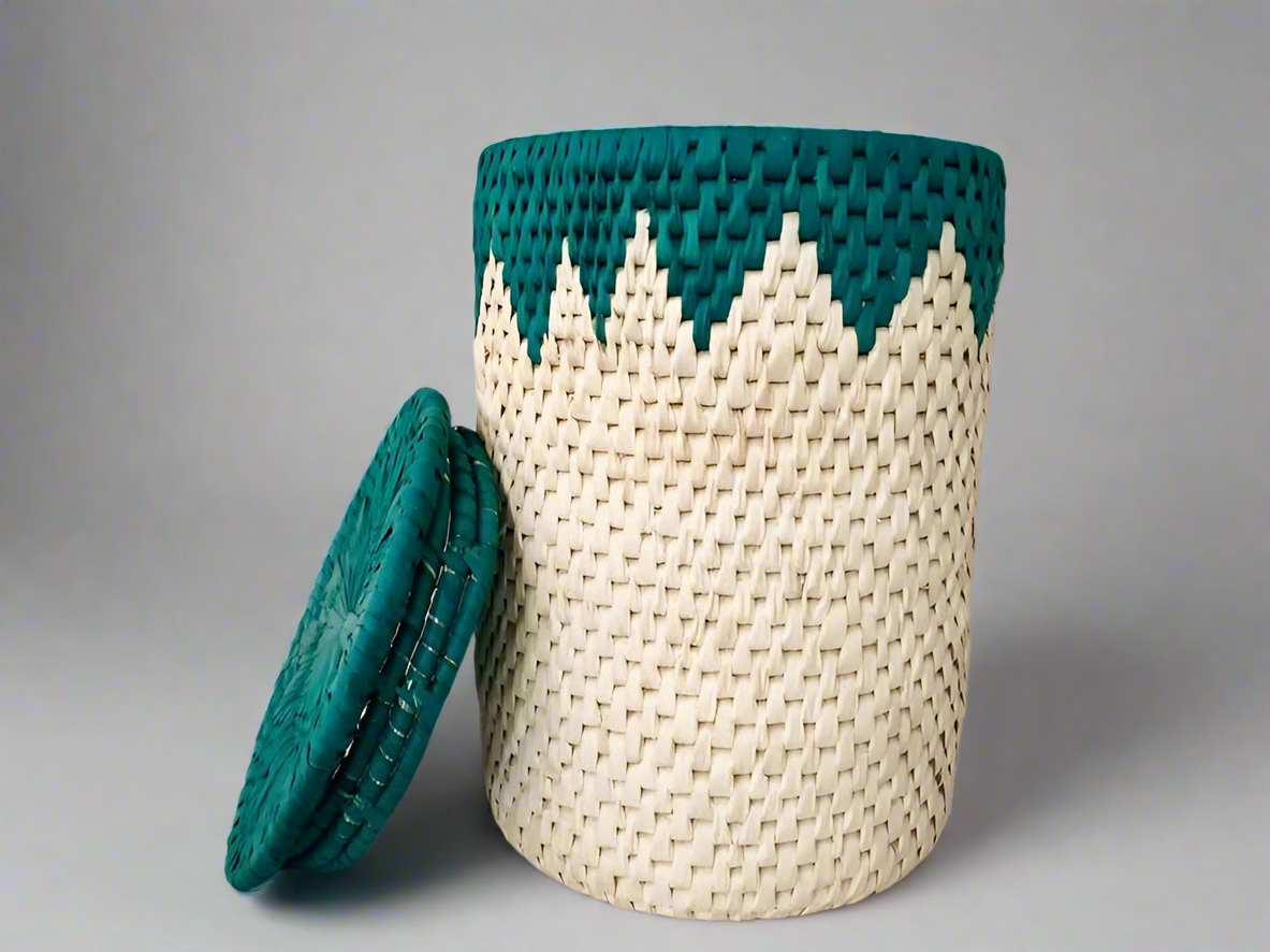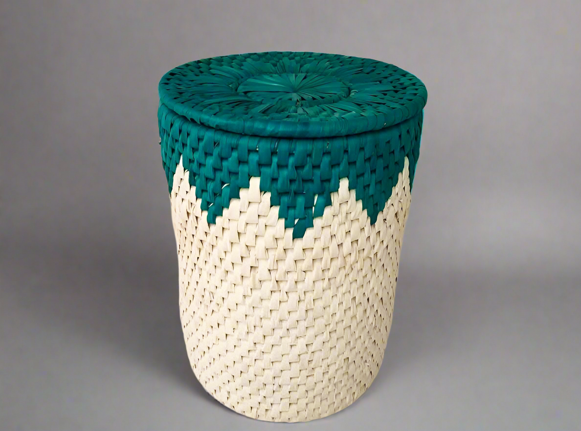This beautifully handcrafted laundry basket is a perfect blend of functionality and artistic craftsmanship. Designed with a sturdy woven structure, it features an elegant off-white base with a striking teal pattern along the top, creating a sophisticated and stylish look. The intricate weaving technique ensures durability and longevity, making it a reliable storage solution for your home.ย With its spacious interior, this basket is ideal for storing laundry, linens, blankets, or other household essentials while keeping your space tidy and organized. The matching lid helps conceal clutter and adds to the overall aesthetic appeal. Lightweight yet strong, it can be easily moved around the house, making laundry organization effortless. Whether placed in a bedroom, bathroom, or laundry room, this eco-friendly basket enhances any space with its natural charm and handmade appeal.