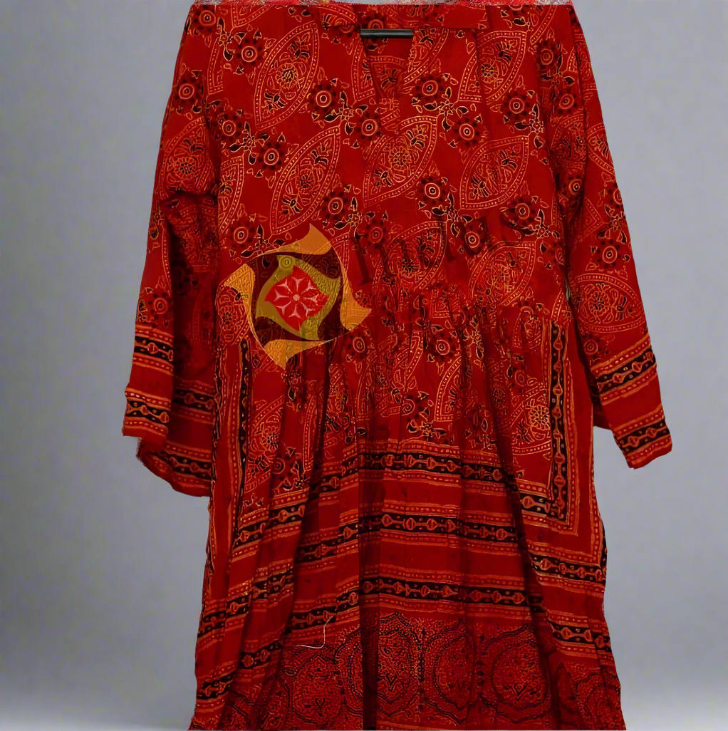 This particular dress features a stunning deep red base, complemented by intricate black and white block prints, creating a mesmerizing pattern that reflects centuries-old Ajrak traditions. Made from eco-friendly fabric, the dress is lightweight, breathable, and soft, ensuring maximum comfort while making a bold style statement.