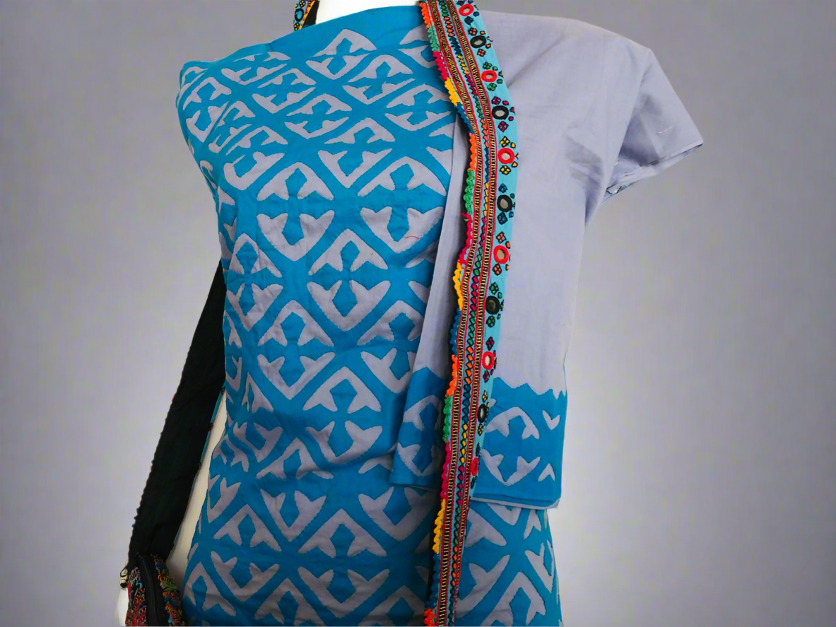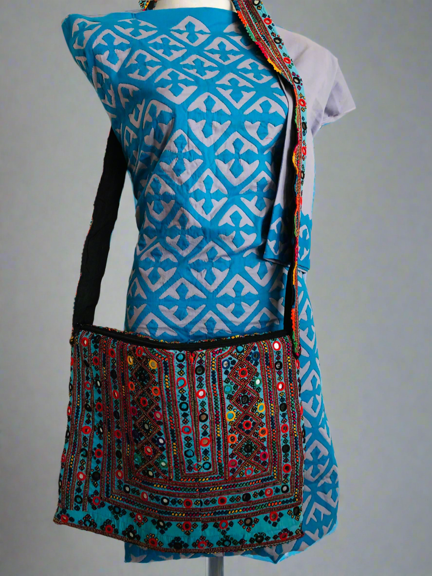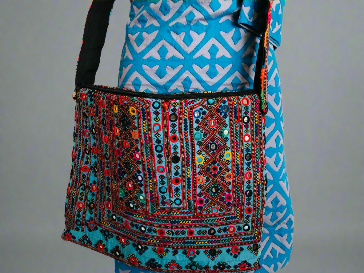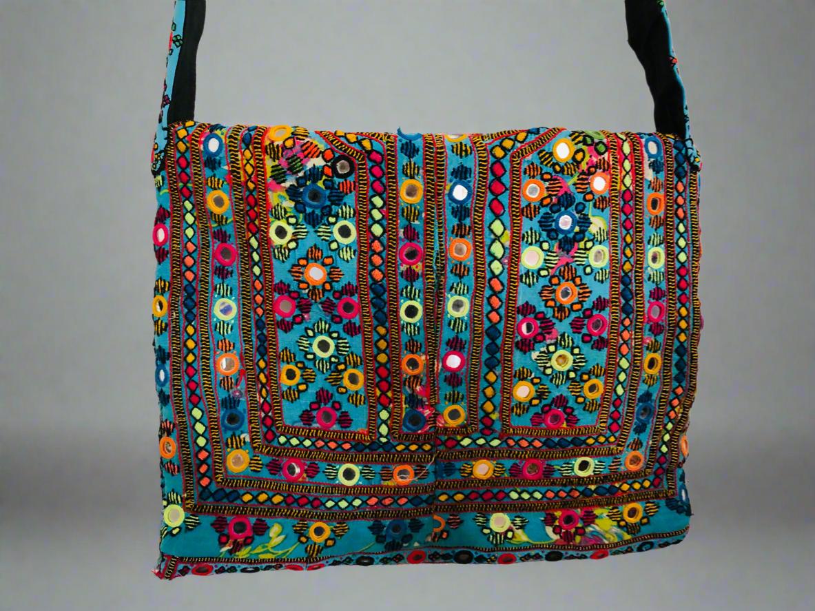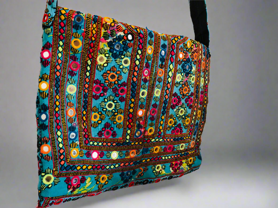 Brighten up your wardrobe with this stunning handcrafted shoulder bag, featuring exquisite embroidery and mirror work on a vibrant blue fabric. Each stitch reflects the artistry of skilled artisans, blending traditional craftsmanship with contemporary fashion. The intricate geometric and floral patterns are enhanced with colorful threadwork and decorative mirrors, making this bag a perfect accessory for cultural events, festivals, or casual outings. Designed with a spacious compartment and a secure flap closure, it offers both style and functionality. Elevate your look with this unique, one-of-a-kind handicraft piece!
