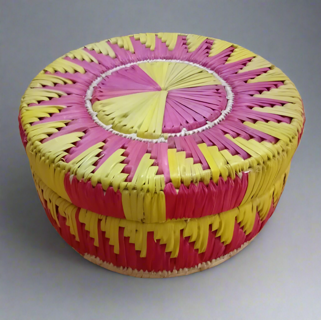 This beautifully handcrafted woven hotpot is a vibrant representation of traditional artistry. Made from natural palm leaves, it features a striking pink and yellow geometric pattern that adds a lively touch to any dining setup. The intricate weaving ensures durability while keeping food warm, making it a perfect blend of aesthetics and utility. Ideal for serving roti, rice, or other warm dishes, this eco-friendly hotpot not only preserves cultural heritage but also promotes sustainable living. A must-have for lovers of handmade crafts and traditional kitchenware!