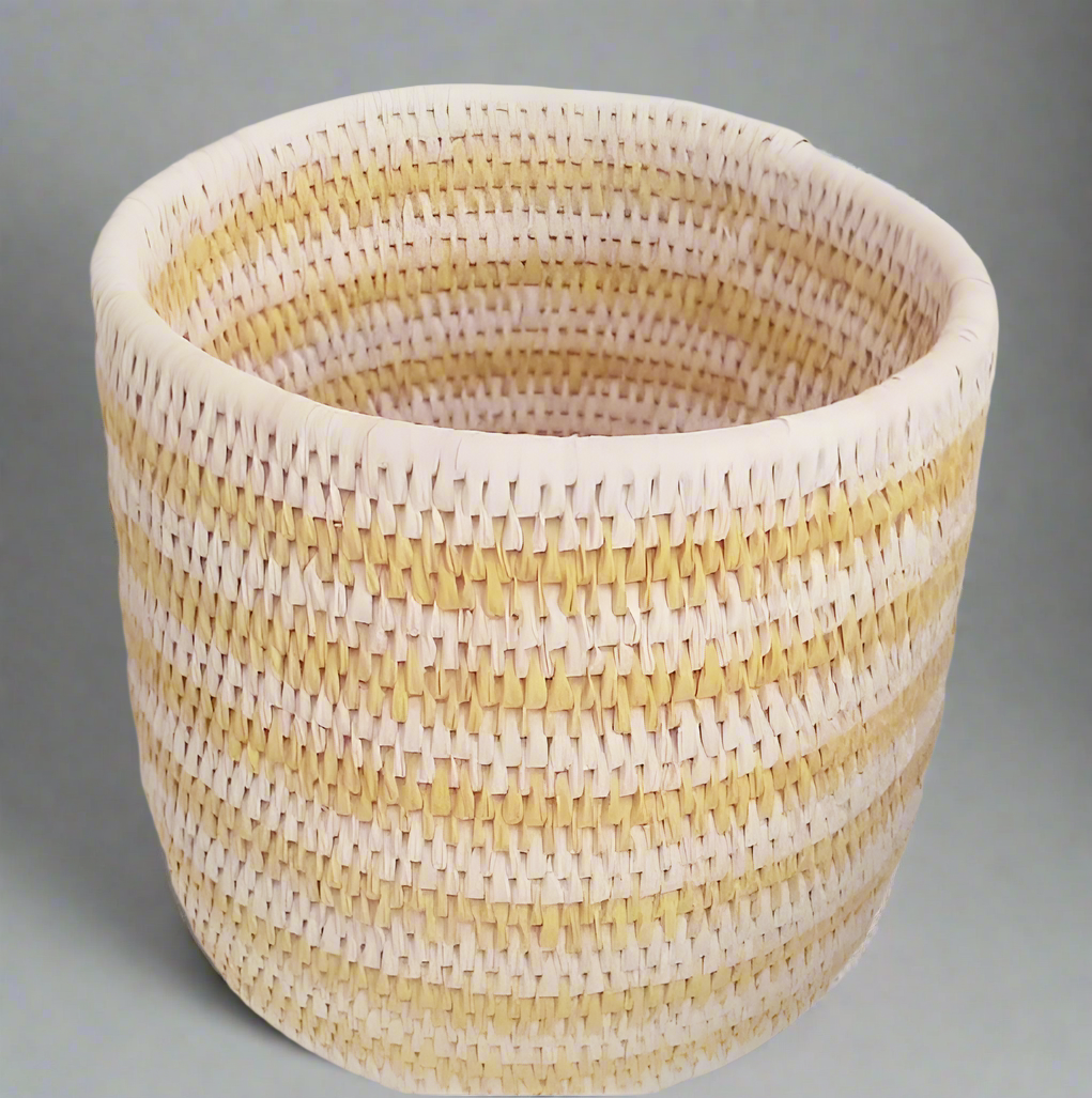 This beautifully handwoven laundry basket showcases a charming striped pattern in natural beige and soft yellow hues. Crafted from sustainable materials, it is lightweight yet sturdy, making it ideal for storing laundry, blankets, toys, or other household essentials. Its minimalist design and warm tones blend seamlessly into any home decor, adding both functionality and elegance to your s