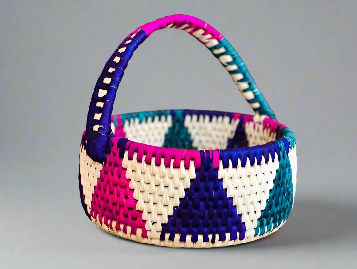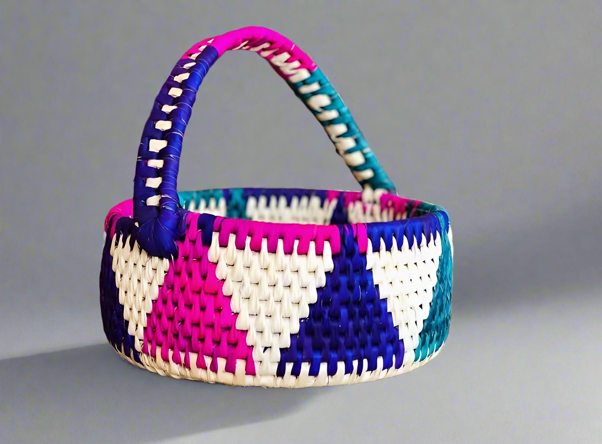 Bring a touch of vibrant tradition to your home with this beautiful handwoven basket, crafted by skilled artisans supported by the Indus Crafts Foundation. Made with natural materials and dyed in a stunning array of colors, this basket is perfect for adding a pop of personality to any room. Use it to store fruits, display flowers, or simply as a unique decorative piece.