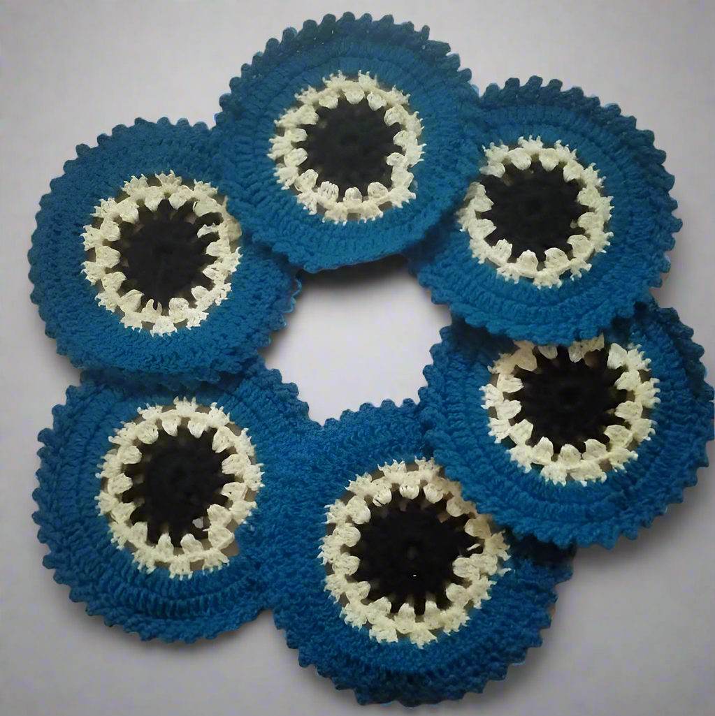 Add a touch of elegance to your table with this beautifully handcrafted crochet coaster set. Featuring a unique circular pattern in vibrant turquoise, cream, and black, these coasters are perfect for protecting surfaces while enhancing your home decor. Ideal for coffee tables, dining tables, or as a thoughtful gift.